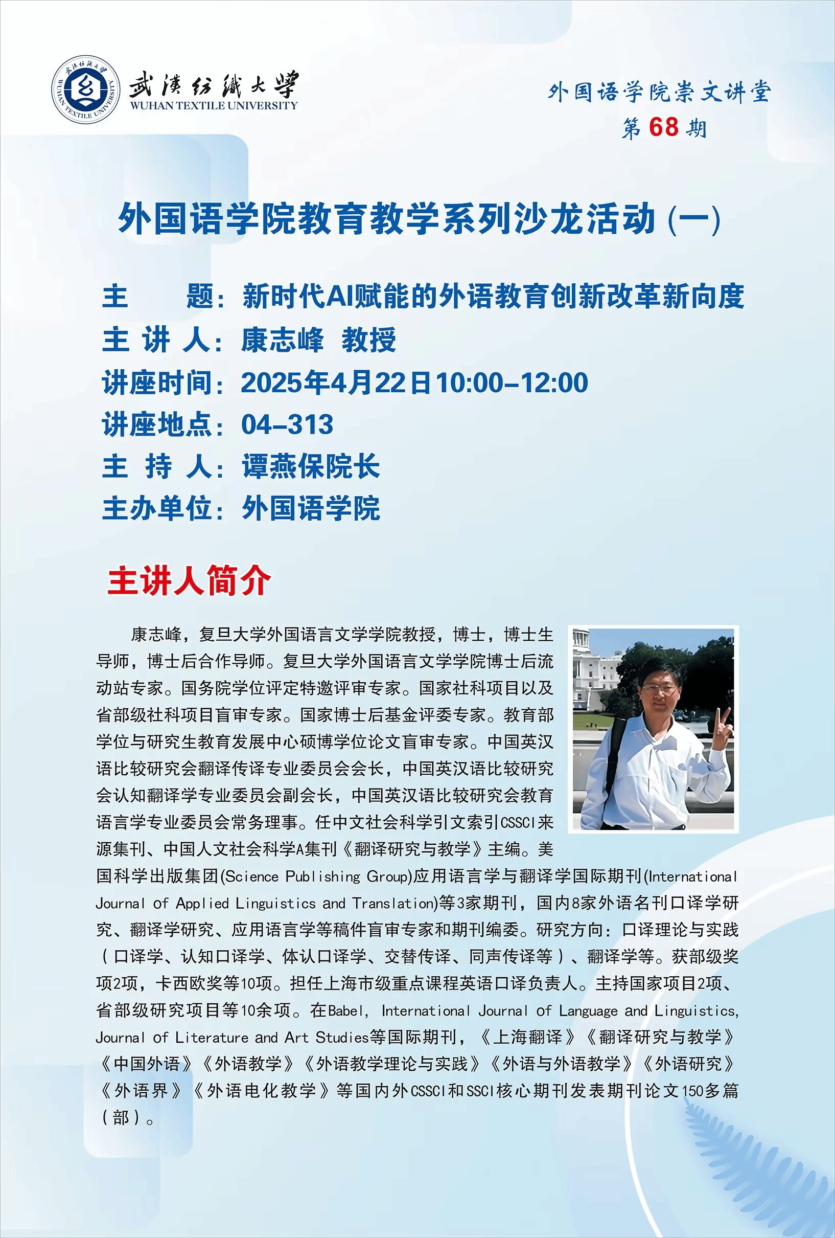 4月22日下午,成人文学 特邀复旦大学外国语言文学学院康志峰教授为学院师生在崇文楼313举办主题为《新时代AI赋能的外语教育创新改革新向度》的讲座。科发院院长吕永钢教授和成人文学 师生一同参加讲座。讲座由成人文学 院长谭燕保教授主持。