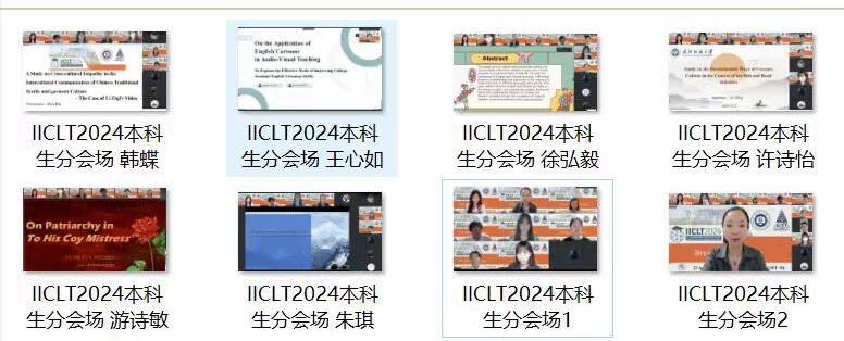 商务英语12201班的韩蝶同学通过A Study on Cross-cultural Empathy in the Intercultural Communication of Chinese Traditional Textile and garment Culture- The Case of Li Ziqi's Video探讨了中国纺织服饰文化在对外传播过程中,涉及的跨文化共情的理论研究及运用。商务英语12101班的王心如同学以A Study of the Influence of the Cartoon-Watching-Based Audio-Lingual Classroom Model on the Development of Daily English Listening Ability为题,讲述了以英语动画片为基础的视听课堂模式,对日常英语听力能力培养的影响研究。英语12101班的徐弘毅同学通过On the Cultural and Environmental Differences through a Comparison between Chineseand English Daily-life Proverbs分析典型中英谚语,探讨了中英之间的文化差异。商务英语12101班的许诗怡同学以Ways of Spreading Ceramic Culture in the Context of the Belt and Road Initiative为题,讲述了“一带一路”背景下陶瓷文化的传播途径,为中国传统陶瓷文化的传播提供了借鉴意义。商务英语12101班的游诗敏同学以On Patriarchy in To his Coy Mistress为题,探讨了该文中的男性主义。英语12001班的朱琪同学的主题是The Spread of Tang Clothing Culture in Japan from the Perspective of Cultural Self-confidence,她试图对比分析唐朝服饰文化和同时期的和服文化,来探讨唐朝服饰文化对日本和服文化的影响。