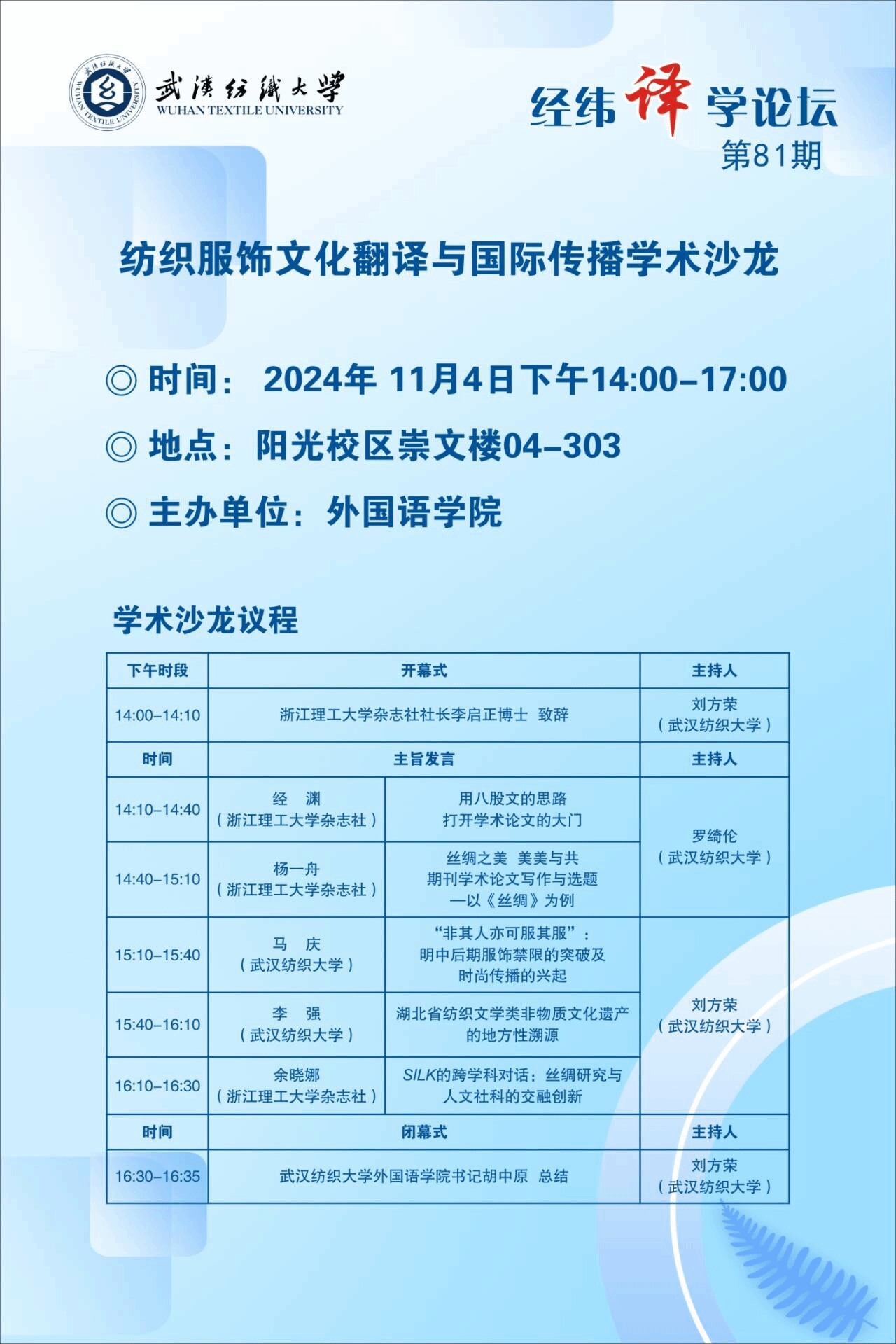 举办了以“纺织服饰文化翻译与国际传播”为主题的学术沙龙。本次沙龙特别邀请浙江理工大学杂志社副社长经渊、学术期刊《丝绸》副主编杨一舟、SILK编辑余晓娜,以及我校传媒学院副院长马庆、期刊社副编审李强作主旨发言。22级、23级及24级MTI研究生参加了此次沙龙。活动由成人文学