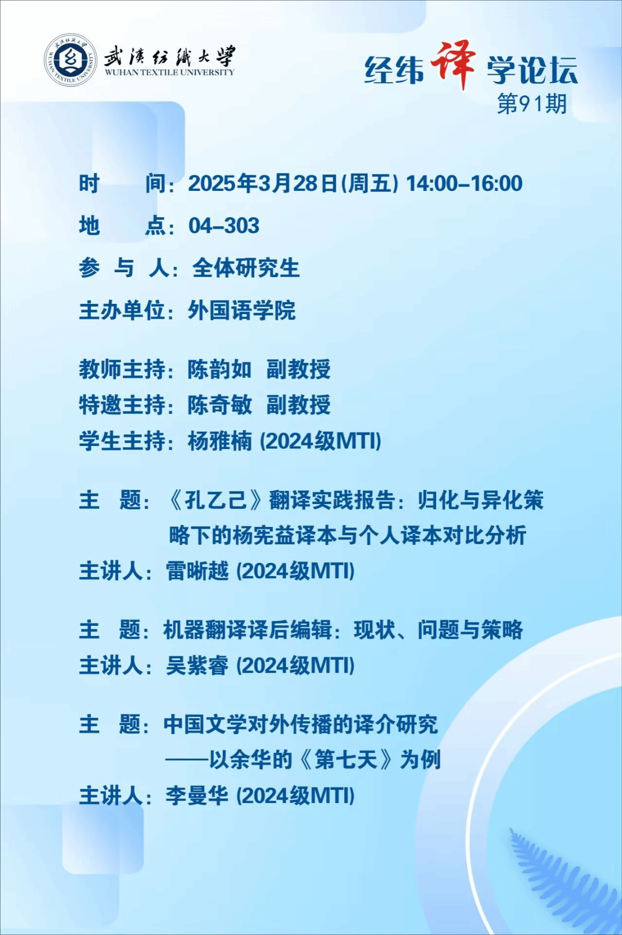 在崇文楼303教室成功举办了第九十一期“经纬译学”研究生论坛。本次论坛由陈韵如副教授和陈奇敏副教授担任教师主持,24级MTI杨雅楠同学担任学生主持。论坛邀请了三位主讲人,分别是24级MTI的雷晰越、吴紫睿、李曼华三位同学。24级全体研究生参与了此次论坛活动。