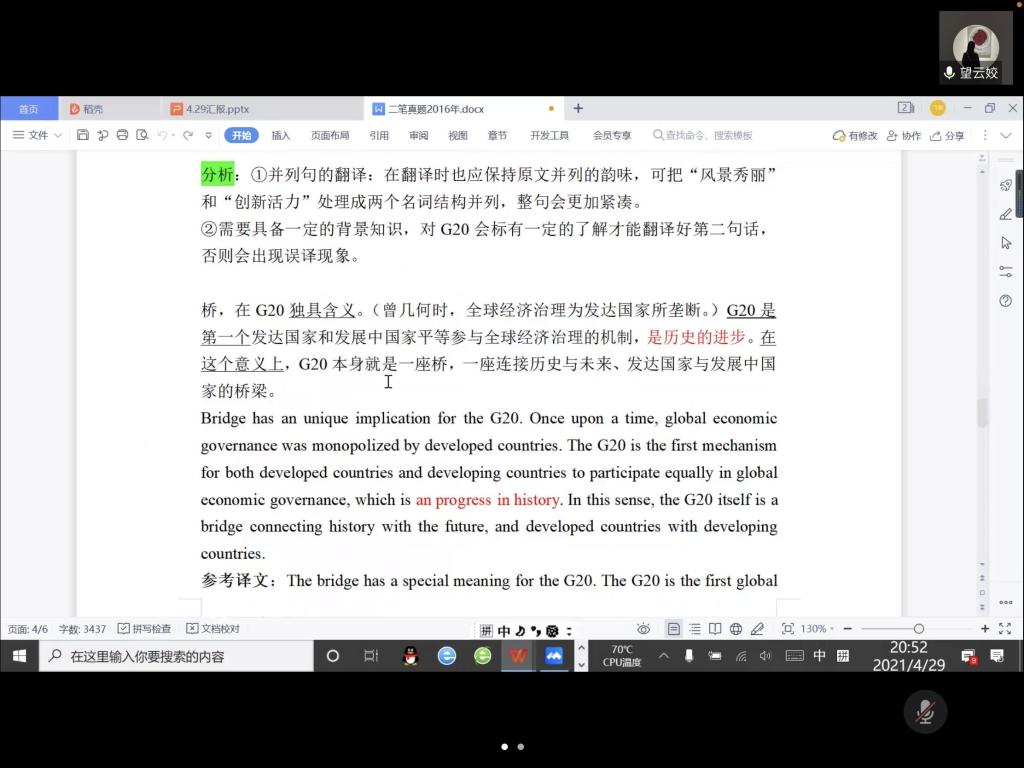 望云姣同学以《二笔真题的自我评析》为主题,通过英译汉和汉译英两篇文章讲解了自己在翻译过程中遇到的难点和自己的翻译技巧、心得。她建议同学们课下多阅读英文报刊,积累地道的英文表达方式,坚持有输入才有输出。