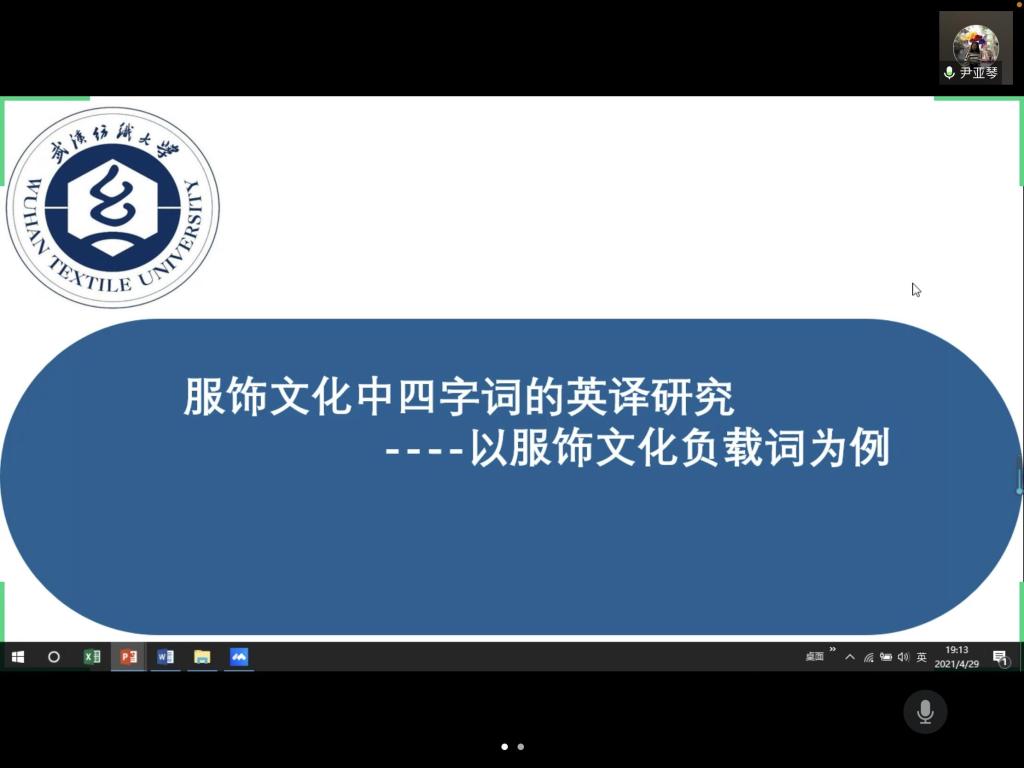 尹亚琴同学以《服饰文化中四字词的英译研究》为主题,以服饰文化负载词为例,以文化翻译观为指导,根据奈达对文化的分类,聚焦于典故文化负载词、社会文化负载词以及宗教文化负载词,对这三类服饰四字词的英译进行论述,提出了关于文化负载词翻译的一些看法和建议。尹亚琴同学表示,在翻译这几类服饰词汇时应专注于文本内部的一致性,以服务目的语为目的,通过意译等方式,保留源语文化负载词原有味道,将一部分文化负载词转化成容易被目标语读者接受的文化意义。同时,也要追求词语的用词精准,语言简练,注重对部分文化负载词提供必要的解释性信息,避免让读者产生不必要的误会,以此来达到文化输出的目的。
