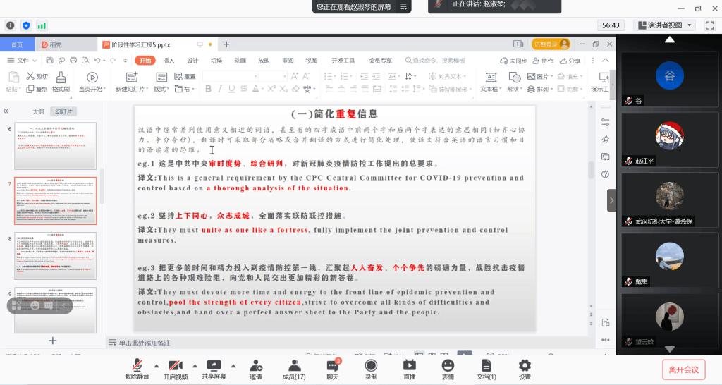 赵淑琴同学以“时政文本英译的简化、增补策略及《无声告白》的读书分享”为主题,以汉语中抽象和具体“动词”的翻译为例,论述了汉语动词的翻译难点及技巧,并切入“时政文本英译中简化翻译策略”的讨论,经过深入研究及重点归纳得出:翻译汉语政治文本时,要做到言简意赅、突出重点,对于非重点且不易以简短文字译出的内容、汉语原文中的重复信息或上文提到过的内容,可以根据实际情况采取简化翻译策略;而中文时政文本中有些词语虽然通俗易懂,但在翻译时却不易简练译出,但由于其他国家与中国的政治经济制度、文化背景、风俗习惯不同,就不可避免的会存在“文化空缺”现象,我们在翻译过程中要注意平衡“原汁原味传播中国文化”与“帮助外国读者理解中国文化”二者之间的关系。