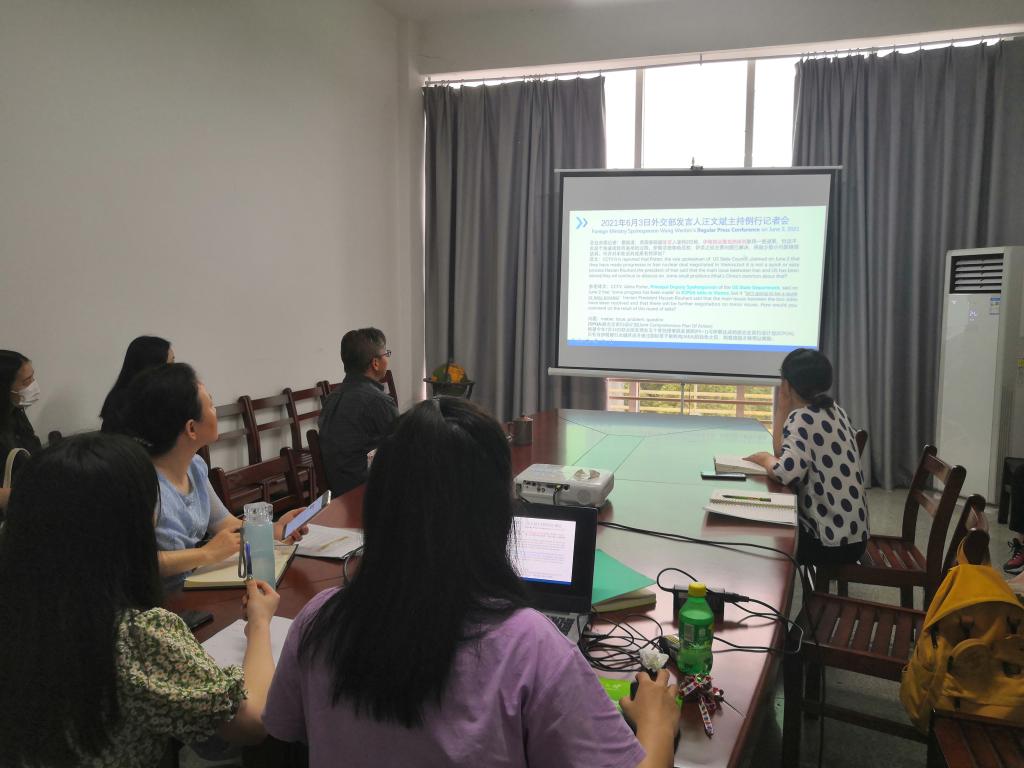 两位同学分享结束后,老师们也进行了精彩的点评。谭院长提出在拿到翻译材料时,应先对其文体和整体风格进行把握,确定一个判断标准。比如徐小月同学分享的文本属于典型的外交话语,在翻译时应该考虑这类文本的风格和特征。外交话语重礼,用词比较圆滑,注重缓冲,对于时态的控制应前后一致,逻辑清晰,只有从一定的高度去认识所要翻译的文本,对其整体行文风格和用词特点进行把握,才能在翻译时更加得心应手,并强调在翻译学习时应进行系统化的归纳与总结,学会研究性学习。柯群胜教授充分肯定了两位同学的选题,表示语法知识是翻译学习中十分必要的一个方面,理清词组之间的语法结构对翻译质量的提高有所帮助,并强调在翻译时政类文本时,要多花时间去查阅相关资料并积累一些特殊表达,翻译出优质译文。姚范美副教授表示语法是翻译学习的基础,不能忽视,翻译实践应紧扣时事,对最新的翻译语料保持敏感度,并分享了一些基本的翻译原则,鼓励同学们在翻译的道路上不断探索,提高自己的学术底蕴。
