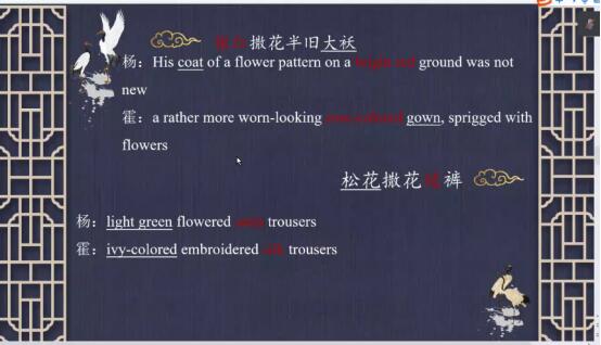 张文化同学的分享以“《红楼梦》第三章贾宝玉服饰翻译对比—以杨、霍两译本为例”为主题,结合校本特色和自己的兴趣,分服饰、配饰和冠冕写鞋袜三个部分对红楼梦中贾宝玉的服饰翻译做了深入对比研究。对两个译本做对比的同时,结合自己的所学,和大家一起深入探讨剖析一些细节问题,比如关于“银红色”的翻译,是杨宪益的“bright red”贴切还是霍克斯的“rose- colored”更胜一筹。陈奇敏老师,赵伟老师从颜色词的文化内涵和跨文化传播角度提出了各自不同的看法。关于“银红色”这个争论,刘珊老师也分享了自己在网上查找到的关于银红色的解释,以及银红色在《红楼梦》中出现的场合,帮助同学们理解这个问题。对此,大家经过自己的查证和通过自己对中国文化的理解,选出了自己认为更合适的翻译。老师们指出,对于学术问题,不下定论,敢于提出质疑诠释了十分宝贵的批判性思维精神。