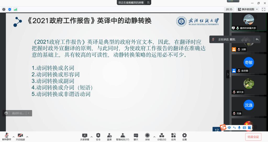 戴思同学以《2021政府工作报告》英译为例,分享了自己对时政外宣翻译的“动静”转换研究。首先她介绍了外宣翻译对中国走出去的重要性、《政府工作报告》的重要性及其研究现状以及动静理论概述。接着介绍了何为外宣翻译以及外宣翻译的原则——“宣”为主,“翻”为辅,以“翻”促宣,然后将英汉语言动静表达特征进行对比,分别论述了汉语动态和英语静态的体现方式。最后戴思同学以《2021政府工作报告》为例分享了五种英译中的动静转换现象——动词转换成名词 、动词转换成形容词、动词转换成副词、动词转换成介词(短语)、动词转换成非谓语动词。