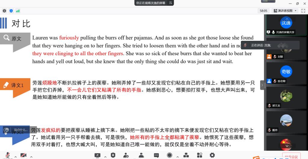 沈逸同学以“翻译练习评析及短篇小说分享“为主题。首先跟大家介绍了短篇小说《侵犯》的精彩片段,有助于大家对情景的了解,从篇章到段落再到字句达到更好的翻译效果。然后将自己对这个片段的翻译与李文俊先生的译文进行对比分析。对于一些字词的处理,沈逸同学也分享了自己的见解与看法,老师同学们非常感兴趣。接着,他从句法、用词、态度方面对自己的翻译过程进行总结分享。最后沈逸同学不仅谈了自己对这篇小说的感悟还与大家分享了爱丽丝门罗短篇小说集八部作品。