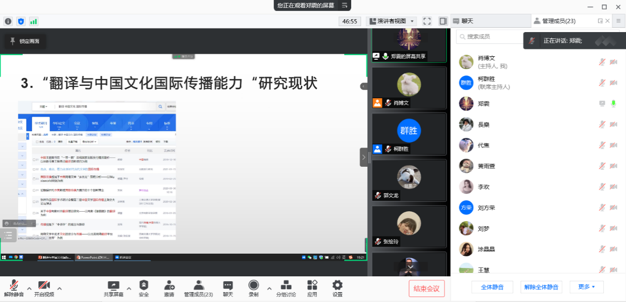 在线上成功举办了第三十四期“经纬译学”研究生论坛。本次论坛由柯群胜副院长主持,21级研究生肖博文、郑震和张绘玲主讲,成人文学