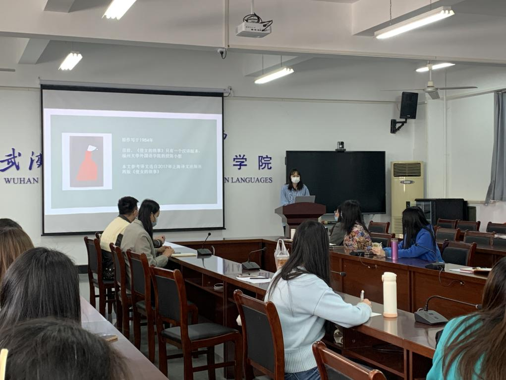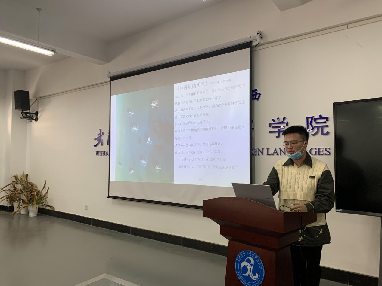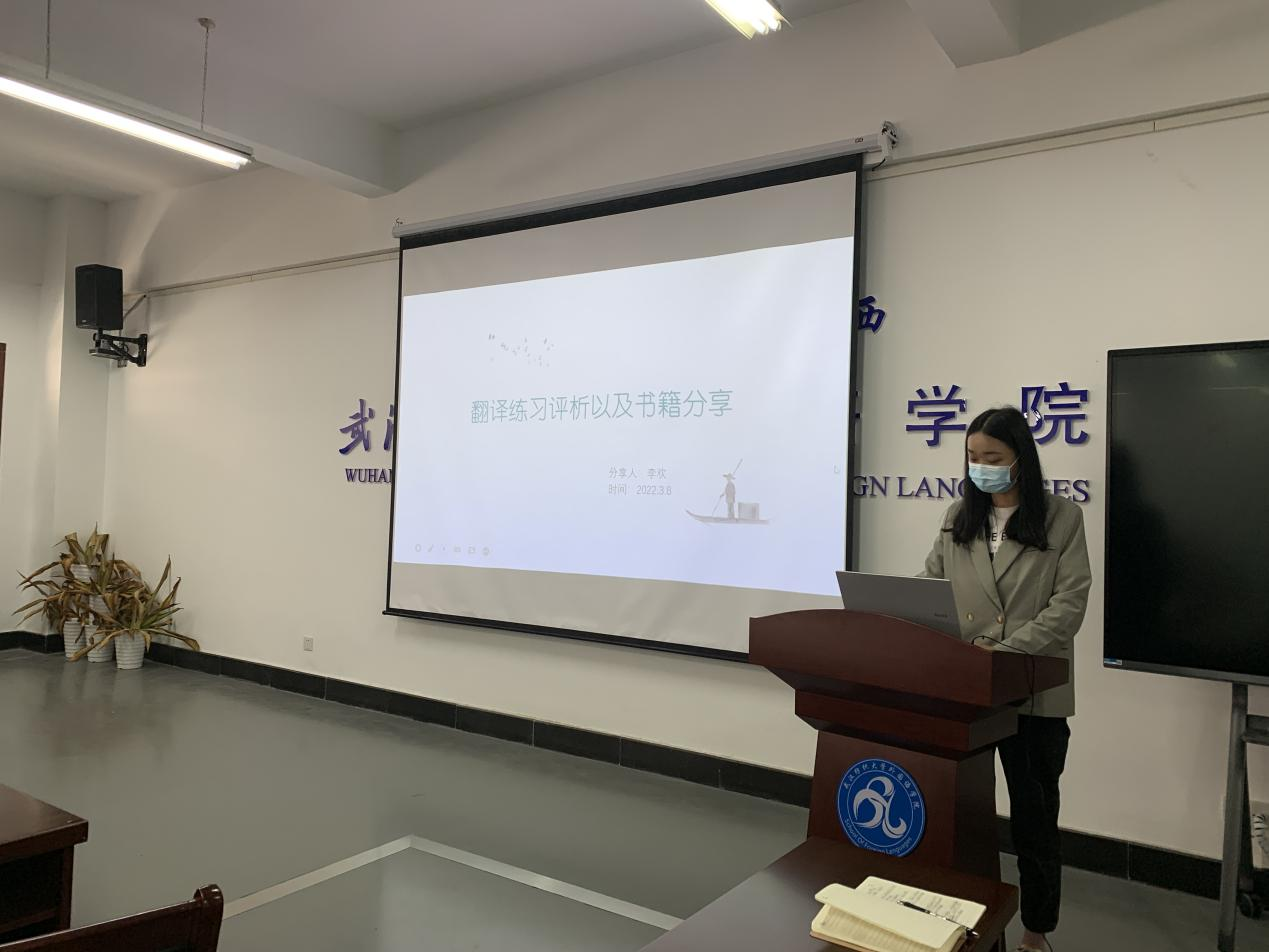 第二位汇报人李欢主题是“翻译练习评析以及书籍分享”。汇报分为两个部分,第一部分以“自然灾害”为翻译材料,将自己的译文与陈小慰的译文进行对比分析。分析完总结出:1.当句子过长或者修饰成分过多,调整语序必不可少;2.适当采取增译法使句子更加清晰流畅;3.为了句子内容衔接更为紧密,可以适当调整词语意思,对句子加以润色。第二部分主要介绍了福建师大学成人文学