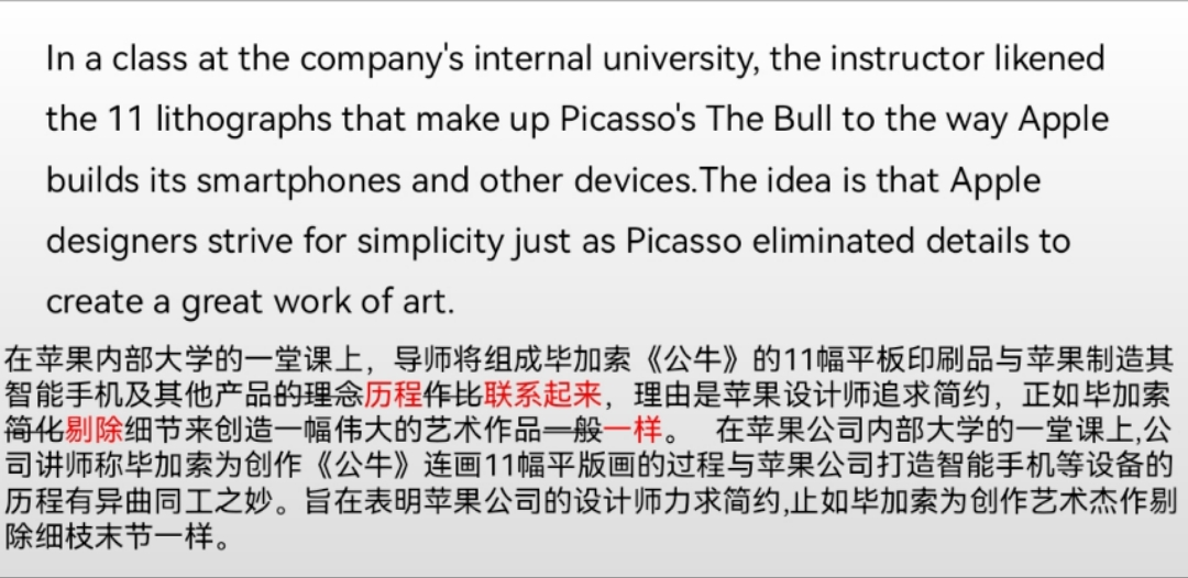 第二位汇报人21级MTI研究生郑震同学选择2015年上半年CATTI翻译考试英译汉真题分析自身的练习,解剖考试重难点以及扣分点,帮助大家从实战的角度更加了解CATTI翻译考试的特点,切身感受CATTI实务的难度。郑震的选篇来源于《纽约时报》2014年8月11日对苹果公司简约设计理念的介绍,原文标题为《简化〈公牛〉:看苹果是如何从毕加索那里学到简洁风格的》,24段共1100余词,命题人节选了9段422词。在逐句对比了自己的译本和官方答案之后,郑震总结了自己翻译的可取之处和不足,并根据翻译考试缩减为一年一次的最新动态鼓励同学们多读外刊,勤加练习,争取一次通过翻译考试。
