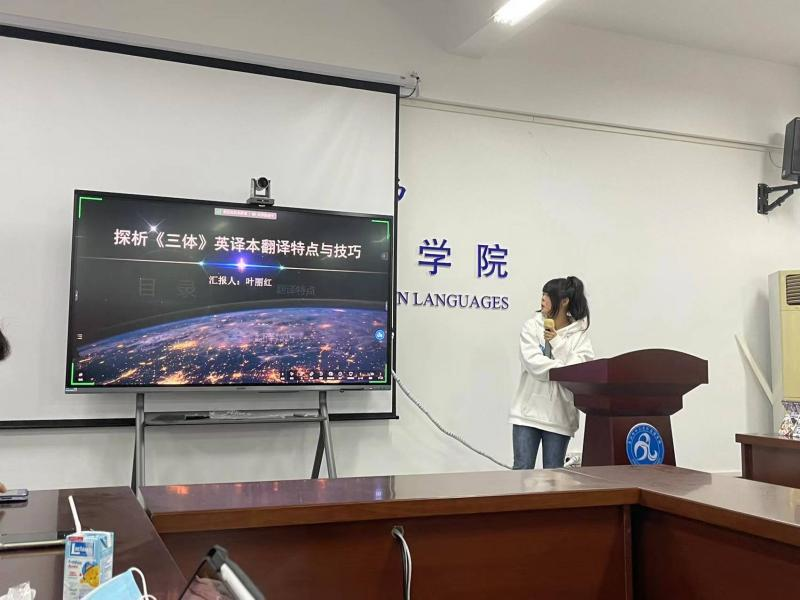 叶丽红同学探析《三体》英译本翻译特点与技巧。她首先从介绍源文本的基本信息,其次讲述了科幻翻译的特点。最后,她着重从本书的具体实例分析科幻翻译特点技巧,以不同的角度切入。尤其指出了其中一个特点--自构词,以此向同学们拓展科幻文本翻译的一大特色。谭院长指出,此次分享中实例分析的时间较短,建议对该部分进行更深刻的阐释,同时可省略背景介绍。罗院长表扬叶丽红语言表达流畅且准确,同时对“智子”的翻译进行了进一步的探讨。刘珊老师认为叶丽红此次分享的自译部分有一定的欠缺,但是认为自构词的统计与整理的部分做得很好,对同学们的研究很有帮助,建议进行语料库整理。刘院长指出,叶丽红自译的内容不够多,要增强自己的思考,中间部分缺少过渡以及逻辑衔接,最后部分缺少具有一定高度的总结。