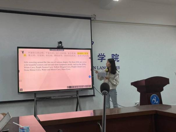 黄金秋同学分享《人间天堂—杭州》一文的翻译技巧评析。她首先从研究背景入手,介绍当下旅游文本翻译的重要性、文本特点和翻译功能。她在案例分析中展示了大量的背景调查,并将自译与参译作对比,总结翻译技巧。例如,与历史文化相关联的信息内容,在翻译时应增加相应的文化背景解释和注释。蔡倩老师指出,在翻译实用文本时译者应明确对象,不能自我代入,即提升“对象感”。陆雪芹老师认为,呼唤型文本的目的是引起读者的思考和共鸣,特点是感染力强、通俗易懂,并表扬了黄金秋同学在翻译实践中的思考,如对“三潭印月”翻译的反复探索。刘珊老师肯定了黄金秋细致地查证工作,包括时间和地点信息的补充,强调学习需要在实践中思考,重视理论升华,并且建议同学们在翻译实践时阅读一些平行文本进行参考。最后,刘院长在总结中指出,翻译实践中要注意句式、语态的统一,分享结束前要进行总结。
