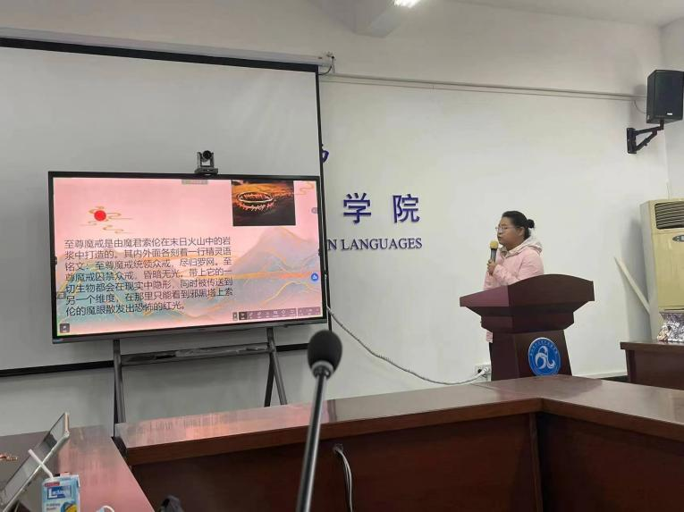 黄培之同学分享的是从阐释学和接受美学视角探讨《魔戒》翻译中的译者主体性。黄培之首先简介《魔戒》,随后给出几种译本及网民对每种译本的评价,由此展开自己的研究。在案例分析中,黄培之进行了不同的阐释并展示了自己的理解。如原著中“The Shire”采用了英国地名常见的“-shire”(本意为郡)词尾,音译成为“霞尔”或“夏尔”更能使人联想到原著的田园景象。刘珊老师指出同学们做分享不能完全删除理论部分,做学术研究不能完全借鉴他人的理论和范例,但也不能完全脱离理论,这就需要同学们在分享时要体现自己的思辨过程,提出自己的观点并找到理论支撑。最后,刘老师建议黄培之同学在今后的分享中减少大段的文字部分,提升阅读体验。罗院长首先表扬了黄培之同学前期准备工作很充分,PPT制作精美,但分享的内容没有具体说明阐释学和接受美学,缺少对译文的评价。同时,罗院长提出疑问:“超自然事物的译名是否必须向现实事物靠齐?”
