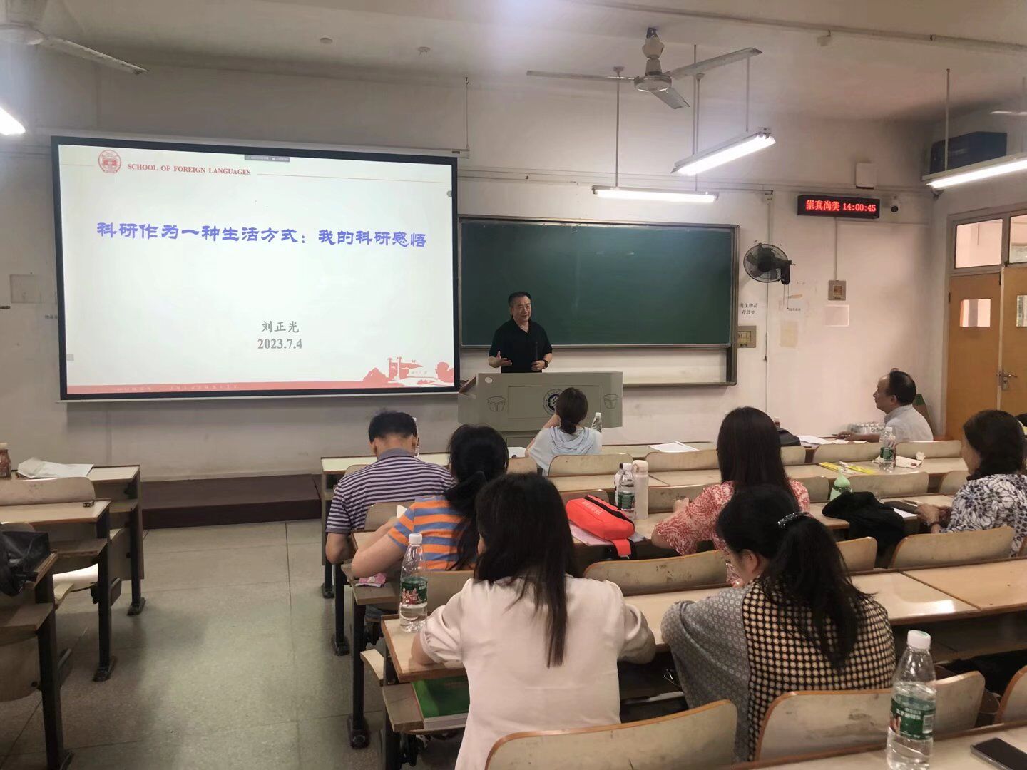 下午,湖南大学的刘正光教授以科研作为一种生活方式为主题,分享了自己的科研经历和科研感悟。刘正光教授从八个方面与研修班进行交流:仰望星空、路在脚下、执着淡定、深读勤思、敏于发现、刀锋磨砺、守望初心、始终坚守。刘正光教授认为,在大学里,教师应该是思想的引领者和传播者,科研可以更好地促进教师工作,因此,教师应该将教学看作自己的研究对象,在里面发现有意义的选题。选题确定后,针对如何写论文的问题,他强调了阅读的重要性。刘正光教授指出,广泛的阅读为我们搭建一个有宽度的知识体系,这为研究的丰富性打下基础;而聚焦阅读,深耕某一领域会增加知识体系的深度。广度和深度的结合会让我们更加容易提炼有价值的选题。关于论文的选题,刘正光教授表示,在阅读文献中,我们要关注其中的研究缺陷和不足,扩展自己的科研视野。有了一个良好的选题和丰厚的知识储备,在论文成型前,作者需要反复地打磨。在语言上,学术语言的使用是基本要求,且语言表述要科学严谨。此外,论文的内容要连贯,层次分明,标题之间逻辑关联清晰,全文形成一个有机整体。最后,刘教授以自身为例,告诉大家,做科研是一项有趣的,却需要耐住寂寞的工作。在繁华的都市生活中,只有守住心中的一片净土,专注阅读,专注写作,科研工作才可以持续推进下去。