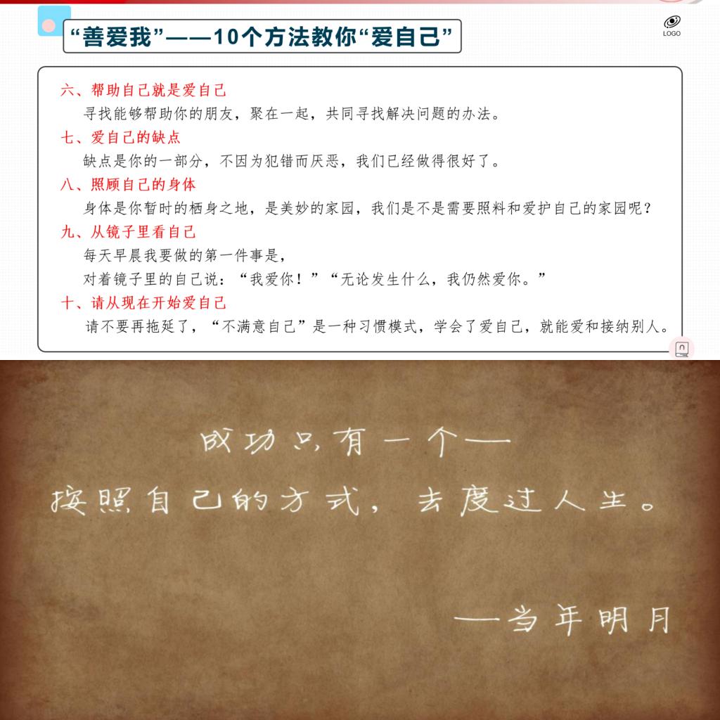 本次班会通过PPT演讲、播放心理宣传相关视频等多种形式宣传了心理健康相关知识,讲述了系统的心理调节方法,并鼓励同学们做一个有责任、有担当、身心健康的新时代青年。学习结束后,同学们还进行了交流,喻蕾同学说:“希望我们一起关爱自己、关注身边的每一个人,希望在这个春暖花开的时节,我们都能向花儿一样绽放。”