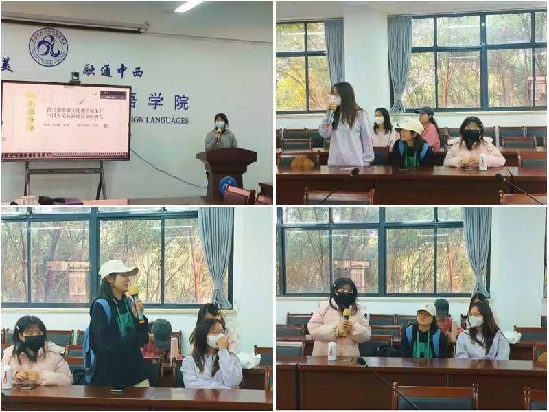 论坛开始,樊静宣同学以省级大创项目为题,探讨了法语联盟对于孔子学院发展的启示以及后期发展规划。对此,黎健老师认为,项目负责人应结合宏观、微观进一步挖掘解决途径,为本项目的后续发展提供了方向与指导。何昊然同学对《简爱》一书深有思考,从自我成长观,择偶观,爱情观,爱情地位来分析女性主义,引发了大家对于新时代女性主义的思考。叶可同学从学科竞赛角度分析了竞赛对于个人成长、学术思维、就业思维等各方面的联动影响,强调了“问题意识”的培养与实践。朱腾同学分享了自己这学期的毕业论文选题与思路,同步分享了如何平衡学习与活动、毕业与毕设的问题,通过她的分享,同学们发现课堂中听课的导向不仅仅是知识,更要有学术,只要有问题、感兴趣,就可以借此做研究,以学术推动学习、用学习再次反推学术。商英12201罗浩诚同学则从一则新闻的主角、挖到其音乐作品、继而从其典型作品中挖到其体现出的文化、教育、历史等,生动演绎了如何从现象看到本质、从学习到学术的过程。