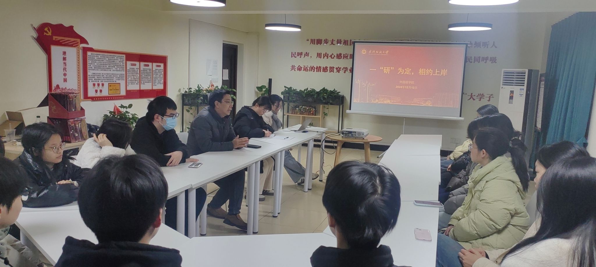 党委书记胡中原深入读“习”有声一站式学生社区,为即将踏上考场的考研学子们送去温暖与鼓励,辅导员甘新敏及2021级考研学生参与会议。