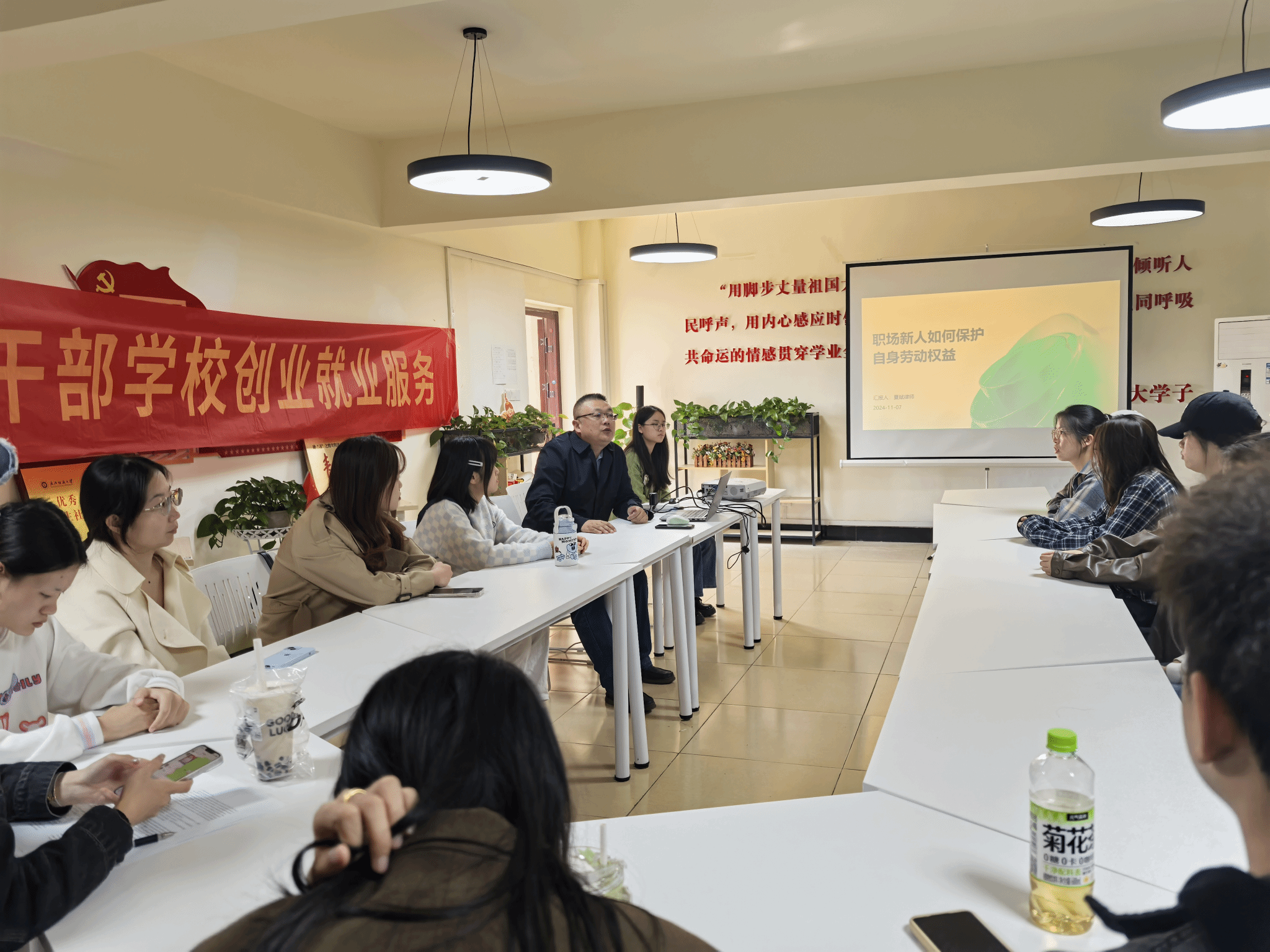 夏律师围绕职场新人最常面临的困境,从大学生毕业后择业过程中如何规避陷阱,以及劳动者如何了解和维护自身合法权益两大方面进行了深入讲解。他首先通过一系列求职陷阱案例,生动地向同学们展示了职场中的潜在风险,并鼓励有过实习经验的同学分享自己的经历,现场互动频繁,气氛活跃。夏律师强调,在劳动者权益受到侵害时,保留相关证据至关重要,并鼓励同学们积极运用法律手段,如劳动法、仲裁机构等途径,来维护自己的正当权益。