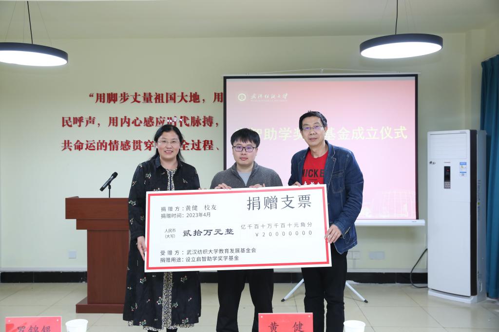 据悉,“启智助学奖学基金”是2022年黄健校友在其毕业中学江西省瑞昌市武山学校创立。本次在纺大,黄健意愿出资五十万元设立“启智助学奖学基金”,第一笔到账二十万元,用于传媒学院和成人文学