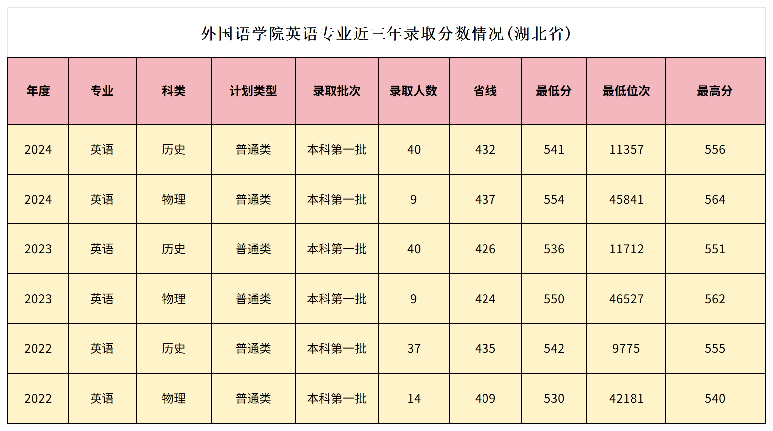成人文学 英语专业近三年录取分数情况(湖北省)