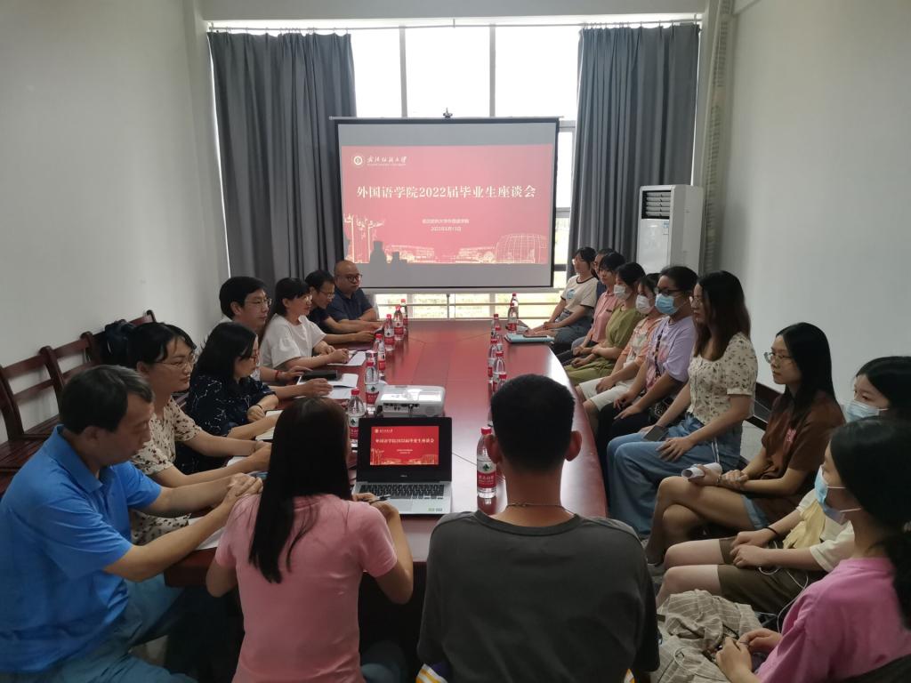 在崇文楼313会议室召开2022届毕业生座谈会。学院党委书记胡中原,院长谭燕保,副院长刘方荣,学院党委副书记彭阳慈航、英语系主任唐娴、班主任代表曹火群、任课教师代表黎健以及部分毕业生代表参加,会议由毕业班辅导员甘新敏主持。