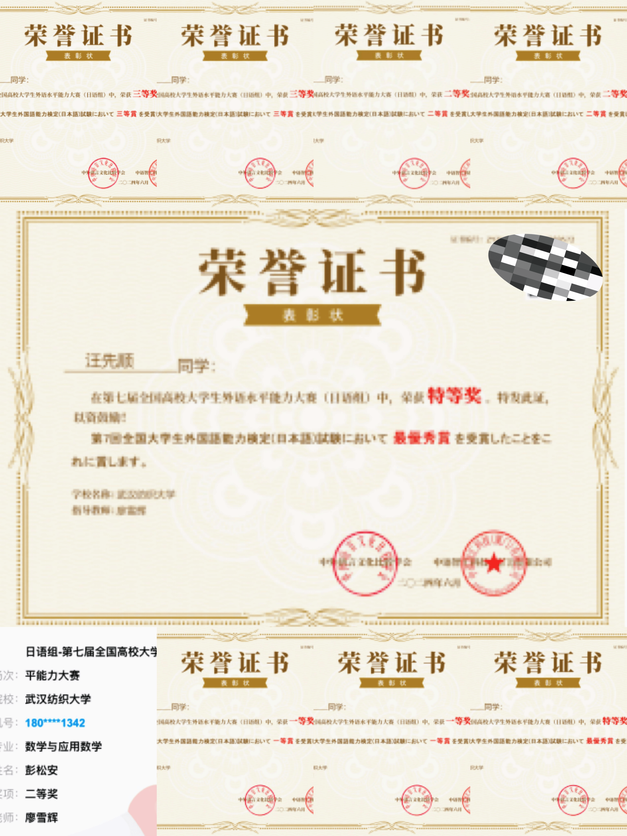 1 | 汪先顺 | 应数12301 | 国家级特等奖 | 廖雪辉 |