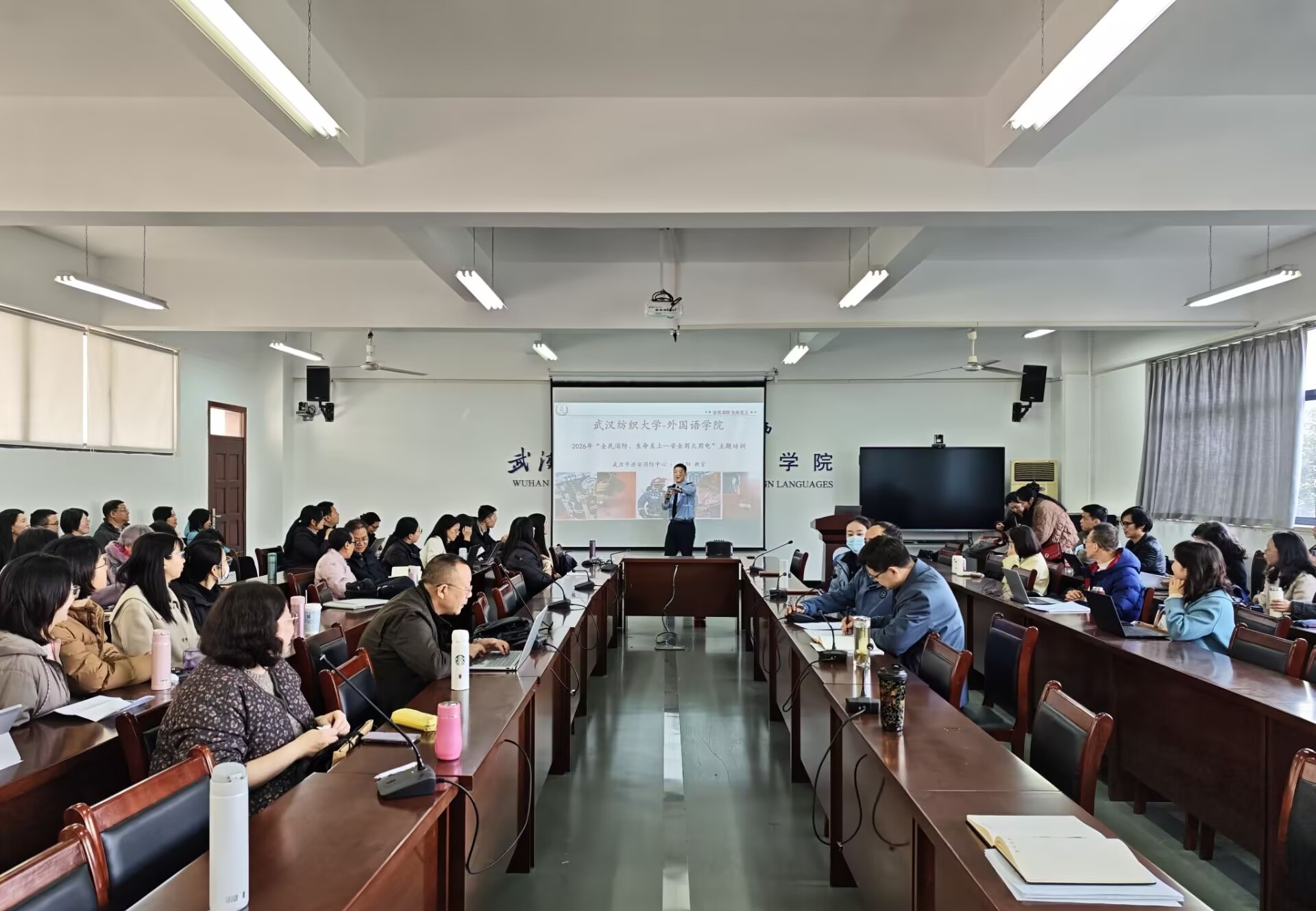 为进一步强化师生消防安全意识,提升应急避险与自救能力,1月15日下午,学院邀请武汉市进安消防中心林阳教官,开展以“全民消防、生命至上--安全用火用电”为主题的消防安全培训。学院全体教职工参加了此次培训。
