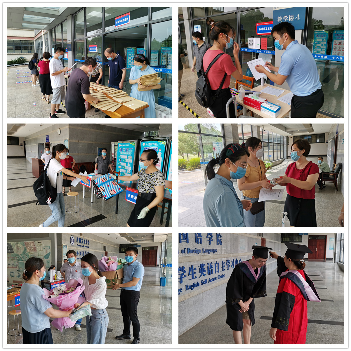 前期,学院党政领导高度重视毕业生返校工作,提早谋划,周密安排。6月12日,学院召开党政联席扩大会议,就毕业生返校相关工作进行专题部署,细化了环节步骤,明确了责任分工。13日,学院相关工作人员放弃周末休息时间,按照“一生一袋”标准备齐毕业生材料,为毕业生统一打印毕业论文,悬挂毕业横幅,设置毕业纪念墙,充分做好氛围营造工作,顺利通过学校纪委督导检查。14日,学院领导、管理人员专门组织毕业生返校流程演练,进一步优化完善“一站式”办理和“全程化”服务,为学生贴心定制了学院专属学士服。同日,学院领导、英语系负责人、辅导员和教师代表通过腾讯会议平台召开毕业生座谈会,听取毕业生代表对大学生活的回顾和分享,以及对学院工作的意见和建议。