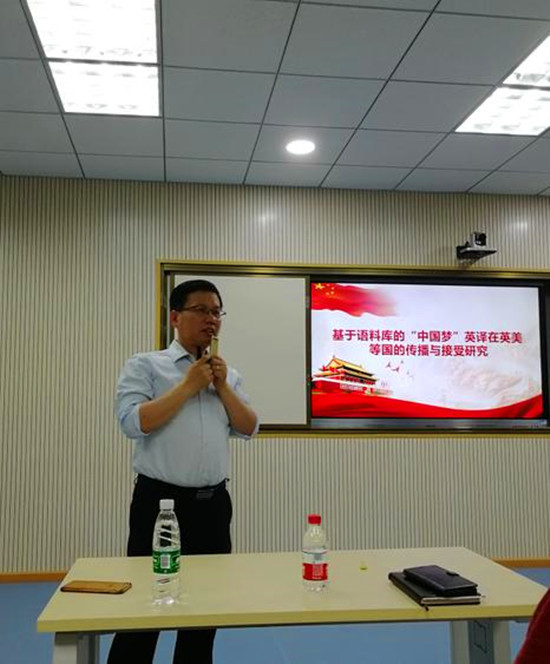 随后,胡开宝教授以“基于语料库的‘中国梦’英译在英美等国的传播与接受研究”为题作科研交流报告。报告以“中国梦”的英译“China dream”和“Chinese dream”为例,以自建的英美等国主流报刊媒体“中国梦”新闻报道语料库为研究平台,依据批评话语分析理论,系统、深入地研究了“中国梦”英译在英美等国的传播和接受。