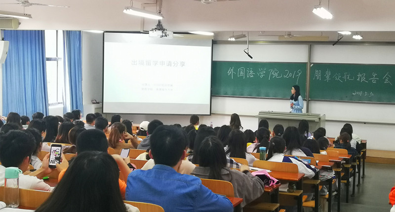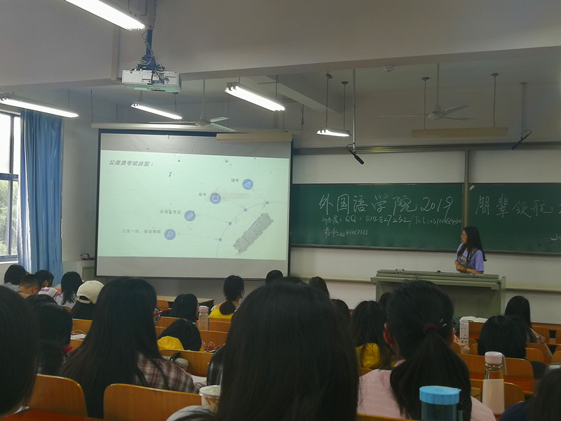 在崇志楼120教室举办了2019年朋辈领航讲座—考研求职出国考公经验分享交流会。2019届优秀毕业生代表梅桂、邱思晨、刘静、向钰受邀出席并作经验交流。学院全体2016级、2017级学生参加。