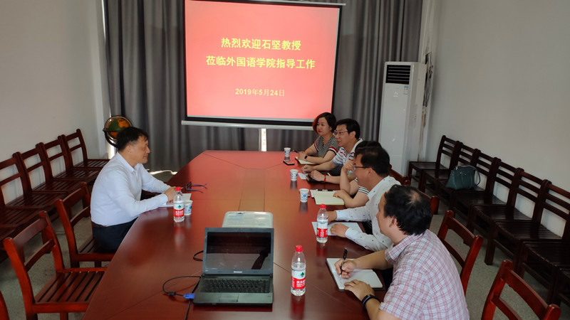 的整体情况和办学理念,深入分析了目前英语专业和大学英语教学普遍存在的问题和差距,石教授结合我校的特色与具体做法给出了解决办法和思路。最后,石坚教授强调,大学教育的目标应该是培养学生终身学习的能力、思辨创新的能力和善于表述的能力。学院领导班子表示受益匪浅,深受启发,拓宽了教学和科研思路。