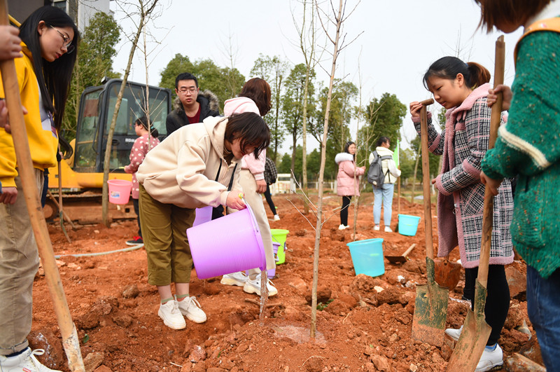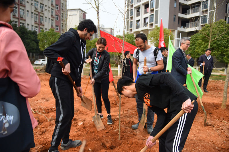 汤富华教授及学院全体班子成员和部分教师代表,校友办、后勤集团、校办、国际学院班子成员及部分工作人员,30余名国际学院留学生及100余名在校大学生参加了此次植树活动。