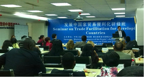 11月4日下午,由中华人民共和国商务部和联合国贸易与发展会议主办,湖北中欧国际职业教育培训中心(CEVTC)承办的“2015年发展中国家贸易便利化研修班”国际会议活动闭幕式在CEVTC中心举行。此次活动历时一个月,共有来自古巴、坦桑尼亚、尼日利亚等20多个发展中国家的43名政府官员参加。本次活动的外事接待和随团翻译工作由成人文学