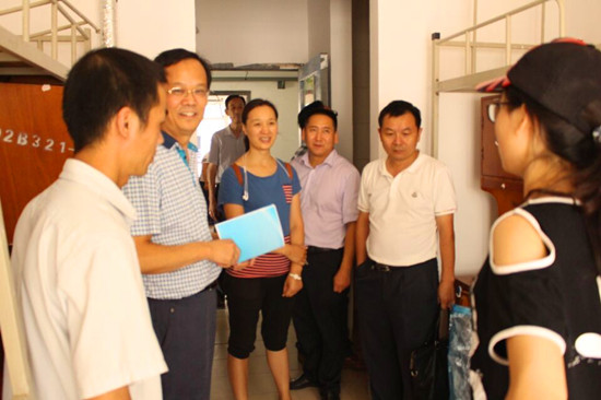 分党委书记陈利民、副书记张鹏等带领下,深入新生寝室,亲切慰问了刚刚报到的2015级新生,并指导学院安全文明宿舍建设,查看三室建设情况。