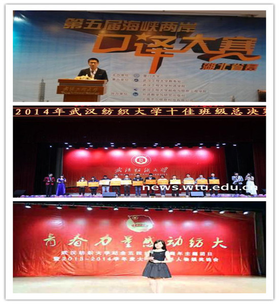 其中王鹏远同学荣获第五届海峡两岸口译大赛湖北省决赛一等奖、荣获中央电视台“希望之星”英语风采大赛湖北省总决赛一等奖、荣获全国大学生英语竞赛专业组一等奖;徐迎同学荣获全国大学生英语竞赛专业组一等奖。学生在重要专业赛事上所获奖项稳步提升,全年学生参加省级以上专业英语相关竞赛获奖达40余项。华妤琪荣获2013-2014年度“成人文学