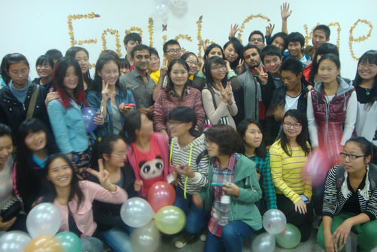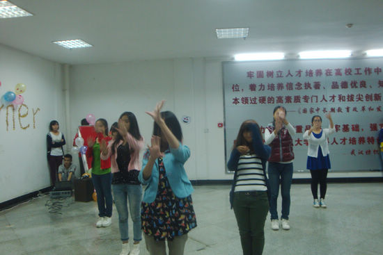 的学子带来Dr.Jolin的开场舞,在极富感染性的音乐和舞蹈的带动下,现场的气氛顿时达到了沸点,大家都随着舞蹈节奏跳动起来。随后,主持人邀请来自牙买加的外教凯琳给大家介绍了万圣节的由来以及当地的习俗,凯琳介绍道,万圣节的主要活动就是“不给糖就捣蛋”,即小孩晚上会穿上化妆服,戴上面具,挨家挨户收集榶果,而且每家每户都会装饰上南瓜灯式样的饰品。随后,同学们饶有兴趣地围绕着万圣节主题的鬼怪,诸如僵尸、鬼魂、女巫、恶魔等进行了热烈的交流,留学生们也讲述着他们的国家举办万圣节的情况。活动尾声,外教、留学生、同学们一起玩了“抢凳子”游戏,大家为能抢到一个凳子而“费尽心机”,游戏进行得热火朝天,每个优胜者都为能得到游戏的棒棒糖奖品而兴奋不已。两个半小时一转眼就过去,意犹未尽的同学们在合影留念的间隙还在询问下次英语角的活动……