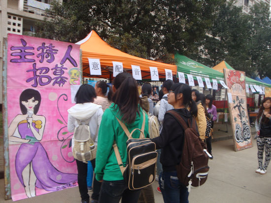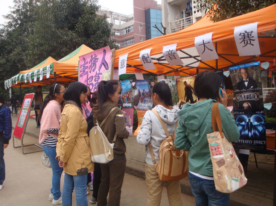 十大校园品牌文化活动------第七届外语文化节正式拉开帷幕。第七届外语文化节之原声电影周暨创意配音大赛、双语主持人招募大赛、外文歌曲大赛、“外研社杯”全国英语写作大赛和“21世纪报”全国英语演讲比赛校园选拔赛以及赴美带薪实习文化交流会等多项活动和赛事报名已在学校阳光校区一食堂二食堂侧门、南湖校区一食堂门口如火如荼地进行着,全校各路“英豪”纷纷报名,准备“一展身手”,报名现场热闹非凡。