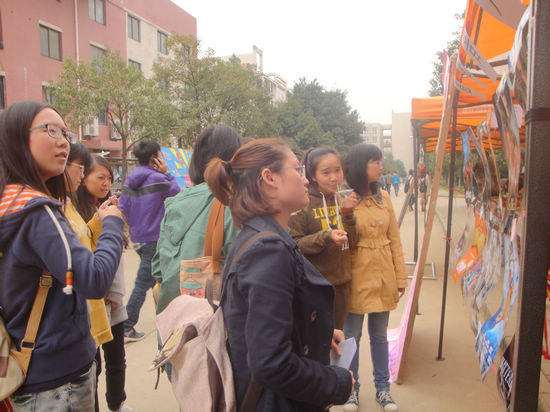 分团委学生会全体成员从不同角度向前来咨询的同学们宣传第七届外语文化节英语演讲比赛、“四六级一帮一”志愿者服务、“一院一星一示范、英语角走进学院”特辑、第20届湖北省翻译大赛、主持人选拔大赛、赴美文化实践交流宣讲会、新加坡海外实践志愿者交流会、原声电影周、创意配音大赛、外文歌曲大赛及“外研社杯”全国英语写作大赛等10大特色和亮点赛事和活动。同学们的宣传和鼓舞激励了报名的同学积极报名参赛,积极准备,争取“学有所乐”、“学有所获”、“赛有所乐”、“赛有所获”,在比赛和竞技中赛出友谊、赛出风格、赛出水平。在丰富多彩的外语文化节活动中感受外语文化的魅力、领略外语文化活动的风情,学习外语文化别样的文化精神。