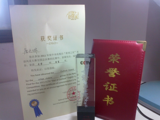 近日,中央电视台主办的2011年“希望之星”英语风采大赛决赛在北京举行,我院英语专业08级学生詹丹琳同学以湖北省大学生组第一名的佳绩获得代表湖北省参加在北京举行的全国大赛的资格,在全国决赛中获得“希望奖”。