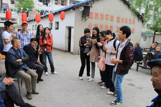 英语1102班王欣怡说:“老吾老以及人之老、敬老爱老是中华民族的伟大传统、这次活动不仅给老人们带来了欢乐,而且纯净了我们的心灵,激励了我们珍惜生活,努力学习的斗志。”