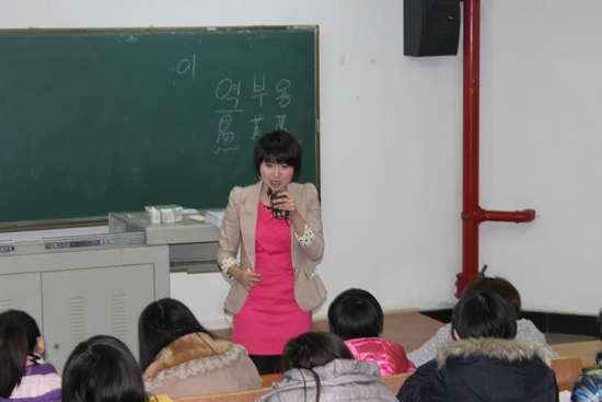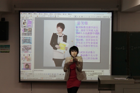 在07-T101举行了一场精彩的韩语文化讲座。新国际外国语培训学校教学部经理易芙蓉老师向我院11级学生,展示了异域他乡——韩国的语言文化和魅力。流利的韩文、精彩的演说、生动的教学……带学生走进一个不一样的国家,体会不同的文化传承。