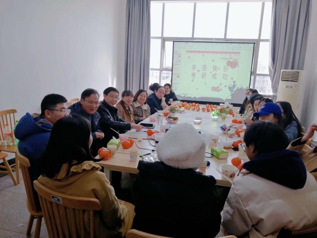 在崇文楼413会议室举办了主题为“冬至快乐,考研‘橙’功”的暖心活动,学院党委书记胡中原、院长谭燕保、副院长柯群胜、罗绮伦、副书记王芳和毕业生辅导员甘新敏、部分考研学生参与活动。