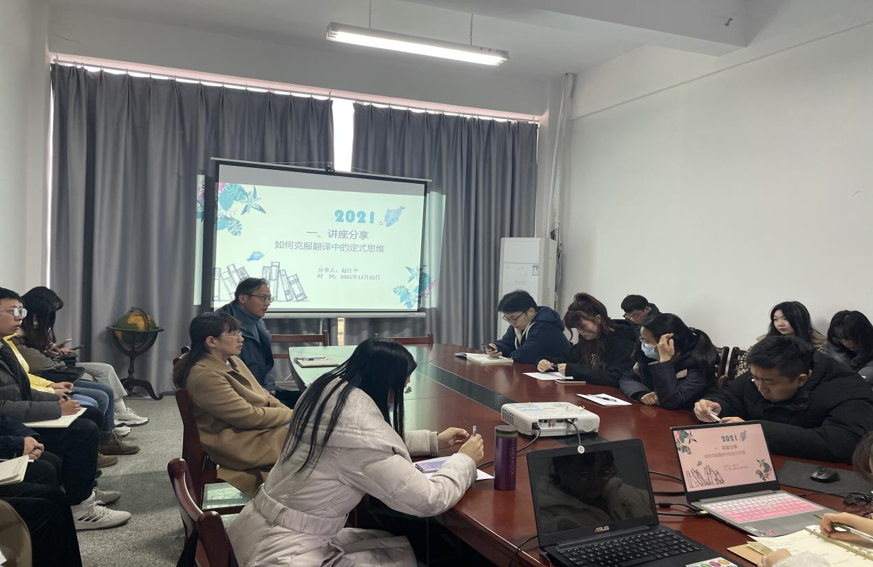 两位同学的分享结束后,师生之间进行了激烈的讨论。随后,对于赵江平同学的分享,赵伟老师认为该同学在讲述时思维清楚,分析得十分透彻,提出的总结与反思同样也适用于21级学生,同时觉得赵江平同学的学习态度值得大家学习。对于呙新同学,赵伟老师指出该同学推荐的语料库和术语库对同学们在翻译时很有帮助,很有启发。随后,刘珊老师首先肯定了两位同学,赵江平同学善于总结反思平时听到的学术讲座,能从文本情感倾向对选词影响的角度比较自己译文和参考译文的区别;呙新同学准备充分,讲述清楚,自学能力强,并鼓励大家自主探究语料库和术语库,并将其运用于翻译实践。随后老师们也指出了一些不足,例如赵江平同学对于揭示讲解“定式思维”例句背后的原因缺乏更深的研究,要进一步去思考;呙新同学的举例碎片化,由于所举例子脱离语篇语境,说服力有所欠缺。