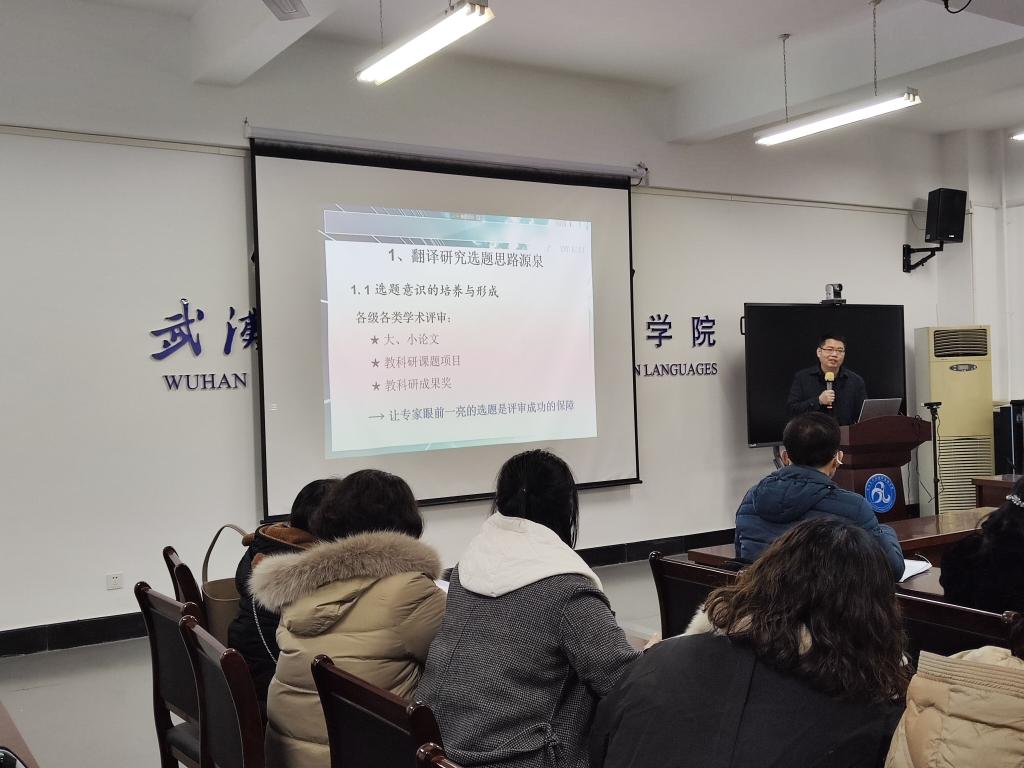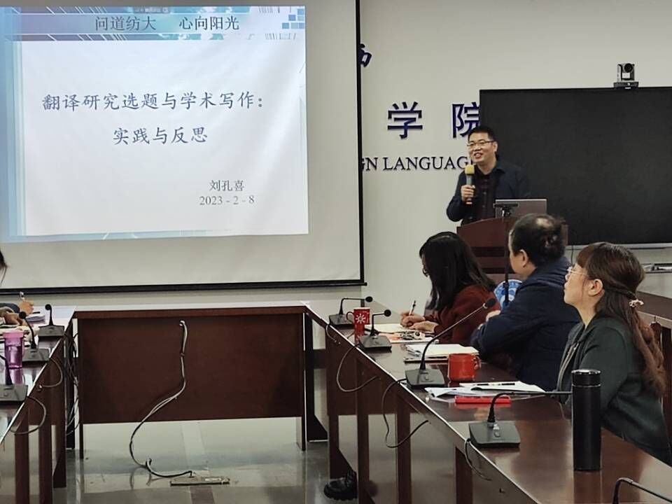 在学院会议室04-303开展了第一场学术活动。湖北民族大学MTI教育中心主任刘孔喜博士受邀为全院教师做了一场学术讲座,题目为:翻译研究选题和学术写作:实践与反思。讲座由学院院长谭燕保教授主持。