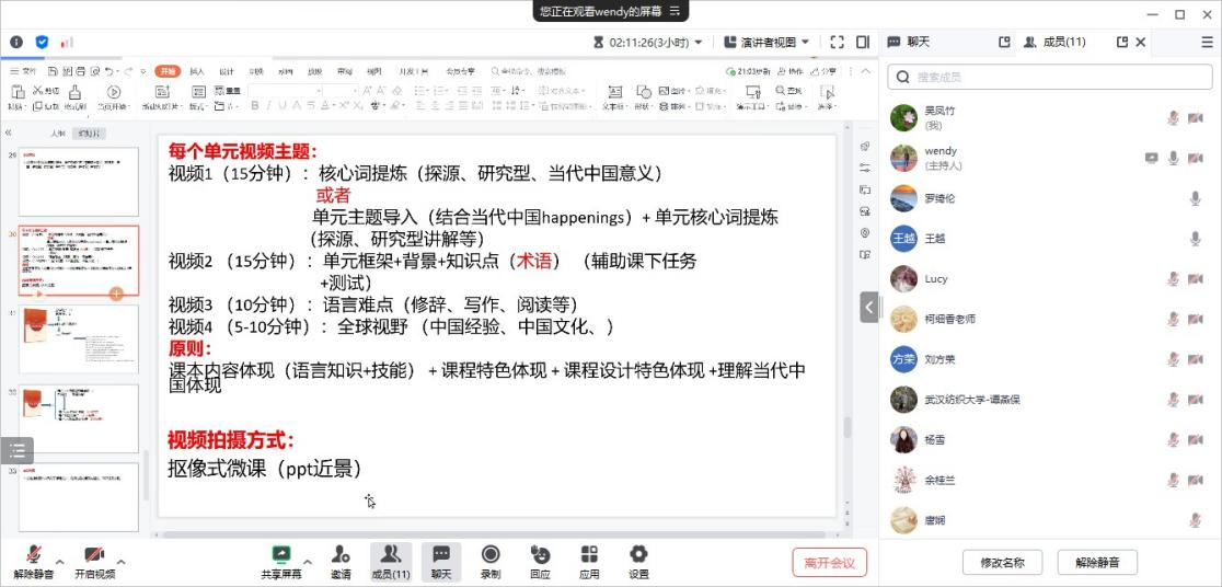 《理解当代中国》系列课程的开展与进展,让与会教师对“三进”工作、新文科建设、课程思政、在线课程等有了更深层次的了解,对后期的工作方向、课程建设目标有了更清晰的认识。基于老师们对《理解当代中国》系列课程的建设经验,尤其是《理解当代中国阅读与写作课程》的深刻认识与丰富教学体验,谭燕保教授谈了自己对本课程每一个主题的见解与上课思路,建议老师们可以透过教材文本从宏观到微观、从国家角度到全球角度去理解当代中国、历史中的中国、未来的中国。“作为教师,我们有了这种视野,这种思维和格局,立德树人、培养一流的外语人才、新时代的国际传播人才目标方可落到实处”,谭燕保教授对课程的后期建设提出了要求与希望。接着,课程团队教师结合自己过去一年的授课体验与经验,谈了后期在线课程建设的看法与建议。