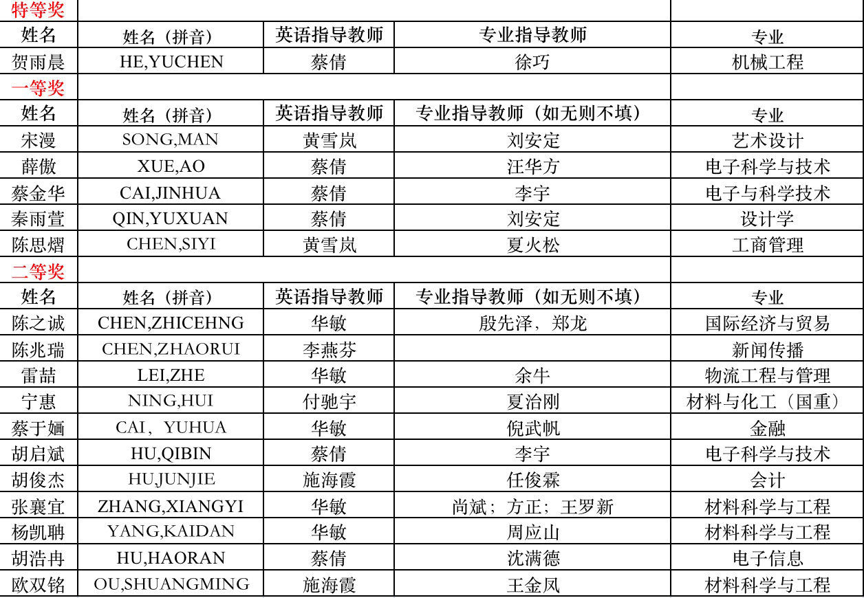 领导高度重视此次竞赛,派出骨干教师华敏,蔡倩,黄雪岚,施海霞等和其他学院的专业教师组成多学科指导团队,历时4个月的时间,悉心指导参赛学生开展英文文献阅读、项目研究调研、英文论文润色及演讲PPT制作、视频录制及现场演练等活动。最终我校学生在强手如云的985,211及其他兄弟院校中脱颖而出,获得了傲人的成绩。本次特等奖获得者贺雨晨感慨道:“老师们很晚了都在帮我们修改(英文讲稿)!感谢老师们的辛勤付出!”本次大赛我校收获特等奖1项,一等奖5项,二等奖11项,三等奖14项,优胜奖16项。