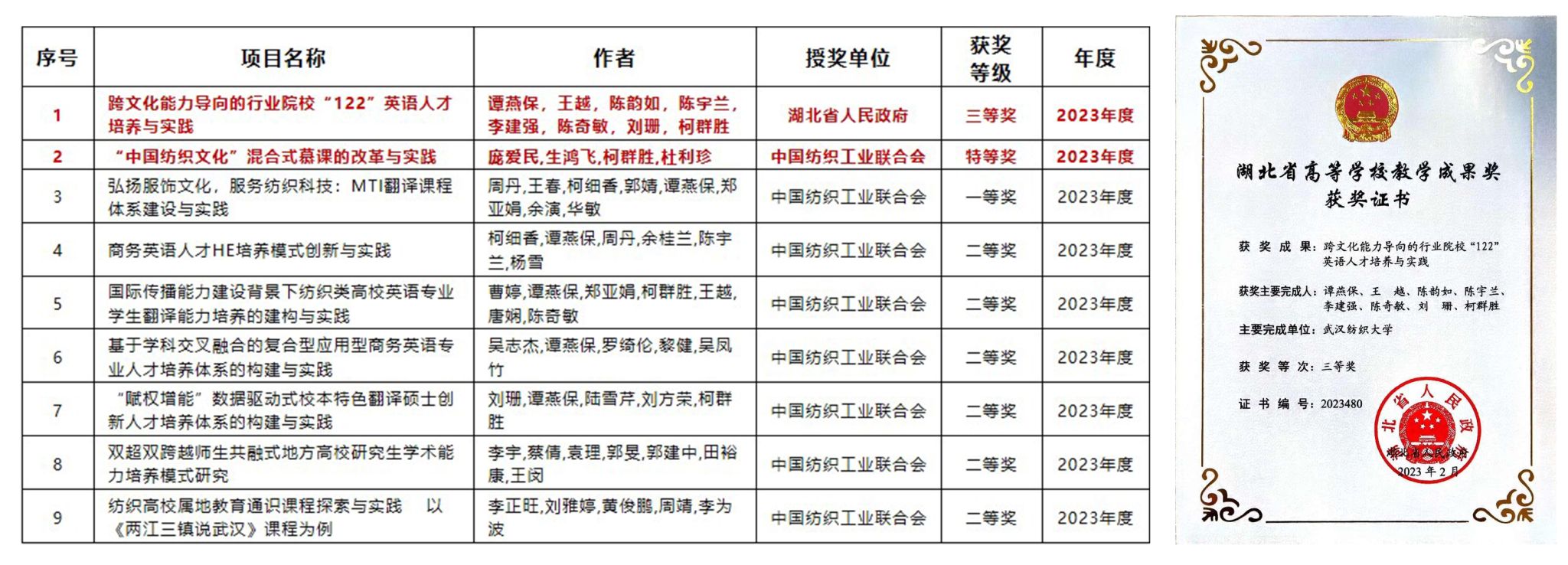 二、连续2届获评湖北省高等学校教学成果奖三等奖1项,获评“纺织之光”中纺联纺织高等教育教学成果奖8项,学院省部级教学成果奖取得新成绩。3月,湖北省人力资源和社会保障厅与省教育厅联合印发《关于公布第九届湖北省高等学校教学成果奖获奖项目的通知》,谭燕保主持《跨文化能力导向的行业院校“122”英语人才培养与实践》获评省级教学成果奖三等奖;9月,中国纺织工业联合会公布《关于授予“纺织之光”2023年度中国纺织工业联合会纺织高等教育教学成果奖的决定》,柯群胜参与《“中国纺织文化”混合式慕课的改革与实践》获评特等奖,周丹主持《弘扬服饰文化,服务纺织科技:MTI翻译课程体系建设与实践 》获评一等奖,柯细香、曹婷、吴志杰、刘珊、蔡倩、刘雅婷主持或参与项目分别获评二等奖。