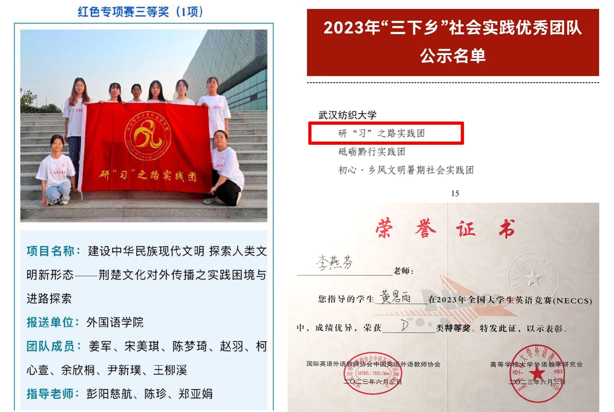 六、首次荣获第十八届“挑战杯”全国大学生课外学术科技作品竞赛(红色专项)全国三等奖1项,获评全国大学生英语竞赛特等奖1项、“外研社•国才杯”理解当代中国全国大学生外语能力大赛国家级银奖1项,首次获评湖北省2023年“三下乡”社会实践优秀团队1个,首次获评“湖北省大学生自强之星”荣誉称号1名,连续9届获评学校“青春力量•感动纺大”大学生榜样人物1名,毕业生考取复旦大学、香港中文大学等重点高校硕士研究生,学院人才培养质量获得新提高。6月,全国大学生英语竞赛决赛成绩揭晓,李燕芬指导黄思雨同学获评特等奖;7月,共青团湖北省委公布2022年度湖北省大学生自强之星名单,黄昕婷同学获评湖北省大学生自强之星荣誉称号;10月,第十八届“挑战杯”全国大学生课外学术科技作品竞赛结果公布,彭阳慈航、郑亚娟指导《建设中华民族现代文明 探索人类文明新形态——荆楚文化对外传播之实践困境与进路探索》荣获红色专项全国三等奖;11月,“外研社•国才杯”理解当代中国全国大学生外语能力大赛英语组阅读赛项国赛获奖名单公布,钱茂华指导李骁原同学获评国家级银奖;12月,共青团湖北省委、省学联发布《2023年湖北省大中专学生志愿者暑期文化科技卫生“三下乡”社会实践活动总结通报结果》,“研‘习’之路”实践团获评社会实践优秀团队;2023届毕业生考取复旦大学、同济大学、华中科技大学、香港中文大学等重点高校硕士研究生,考研升学率达到25%,增长率超100%。