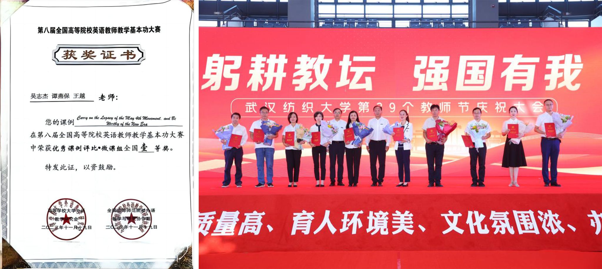 2023年“最美教师”“最美纺大人”获奖人选的决定》,吴卉获评“最美教师”;10月,外语教学与研究出版社公布2023年全国高校外语课程思政教学案例大赛获奖名单,谭燕保荣获一等奖;11月,第八届全国高等院校英语教师教学基本功大赛在浙江工业大学举行,吴志杰荣获一等奖、吴凤竹荣获三等奖。