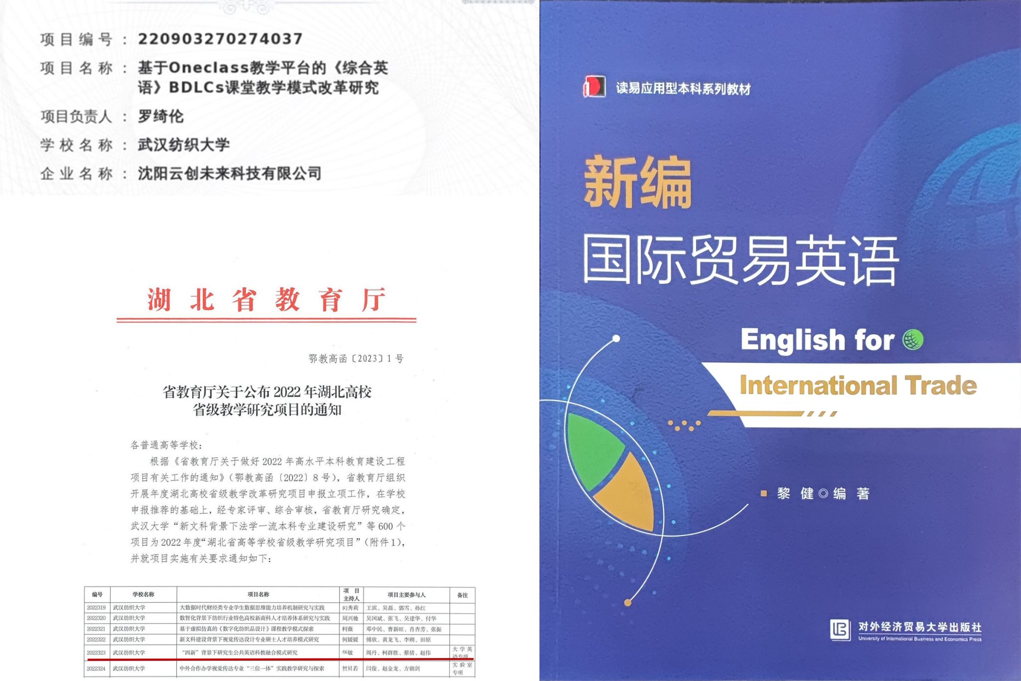 四、连续获批教育部产学合作协同育人教学改革研究项目2项,获批湖北省省级教学改革研究项目1项,出版应用型本科系列教材1本,学院教学改革及教材建设取得新成效。2月,湖北省教育厅发布《省教育厅关于公布2022年湖北高校省级教学研究项目的通知》,华敏主持《“四新”背景下研究生公共英语科教融合模式研究》获得立项;12月,教育部发布《教育部高等教育司关于公布2023年产学合作协同育人项目立项名单的通知》,罗绮伦主持《基于Oneclass教学平台的〈综合英语〉BDLCs课堂教学模式改革研究》和刘雅婷主持《产学协同“语言、思辨、素养”三元融合的混合式大学英语优质课程建设》获批立项;12月,对外经济贸易大学出版社出版黎健主编读易应用型本科系列教材《新编国际贸易英语》。
